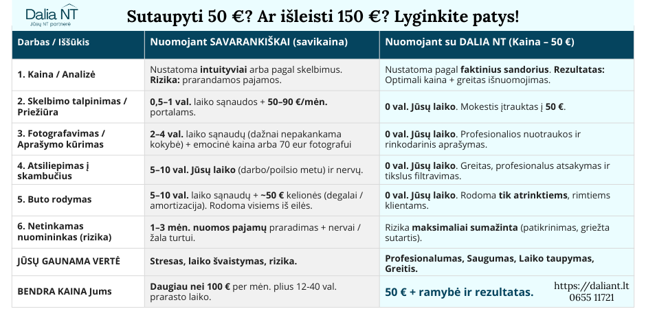 Nuomojant butą savarankiškai dažniausiai susiduriama su trimis tipų kaštais: laiku, pinigais ir emocine energija. Kai sudedame viską į vieną vietą, paaiškėja, kad procesas pareikalauja gerokai daugiau, nei atrodo iš pirmo žvilgsnio.